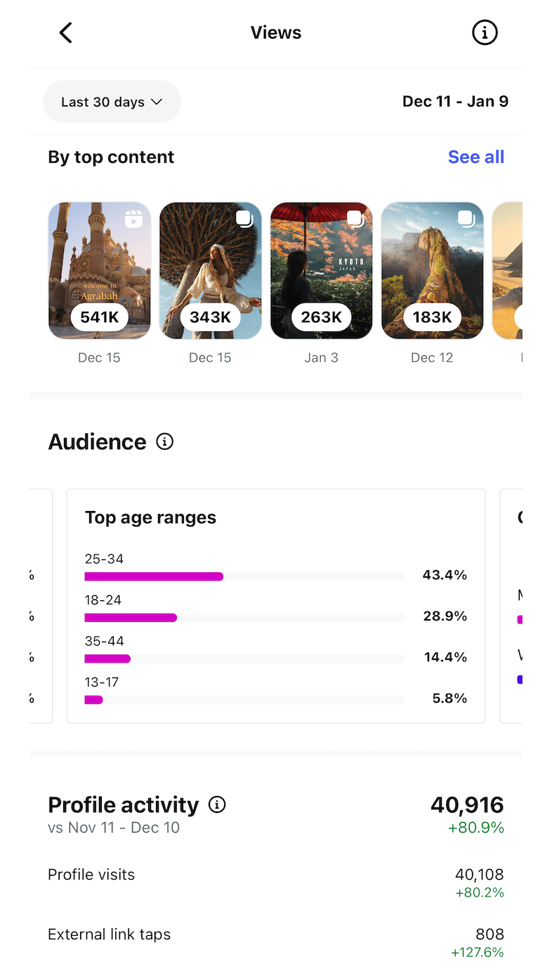 The Socotra content performed especially well. One of my Egypt reels hit 541K views, and several others cleared 250K+. Meanwhile, 3 of my 4 top-performing posts were photo carousel posts, which is somewhat unusual.